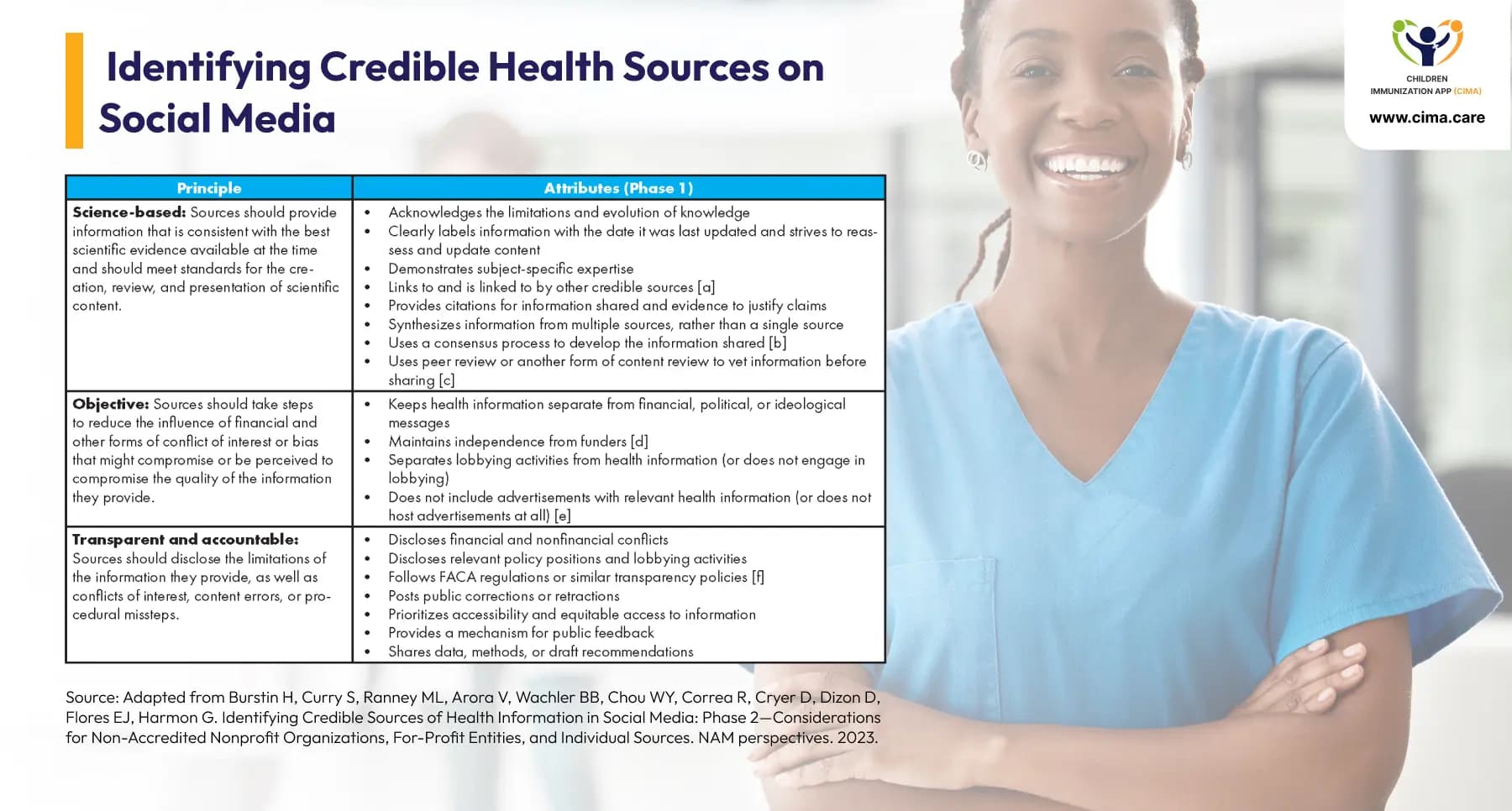 - 2- Healthcare Providers Education: Through the CIMA Health Academy, healthcare professionals receive CPD-certified training in vaccination science and communication strategies. The curriculum aligns with WHO's principles for credible health information sources, emphasizing evidence-based practice and effective communication. Through free online Continuous Professional Development and collaboration with trusted international institutions, CIMA Health Academy strengthens the foundation of reliable health information ecosystems worldwide.