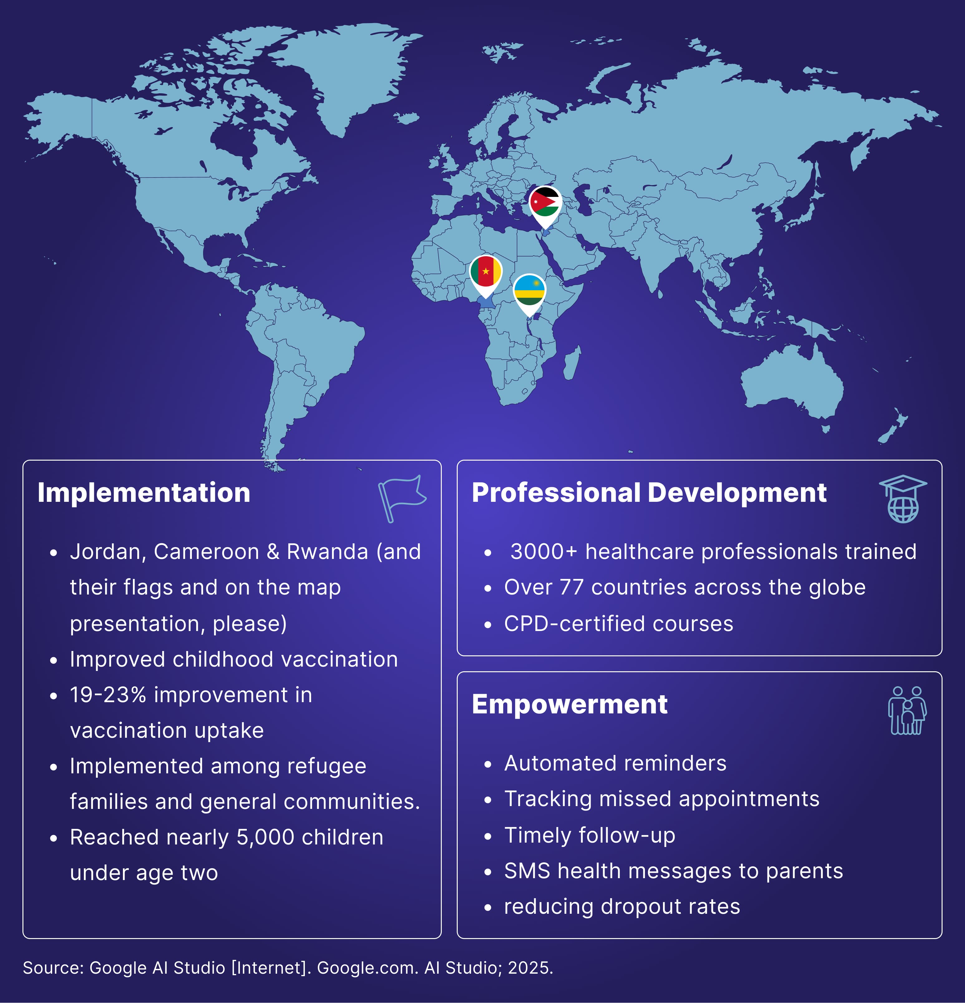Being selected among 27 global case studies from diverse health systems demonstrates that CIMA meets the highest standards of effectiveness, sustainability, and replicability. Our work in Jordan, Cameroon, and Rwanda shows that technology, when paired with cultural competence and trust-building, can transform health outcomes for families on the move.
