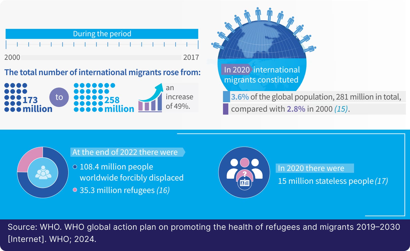 With approximately 1 billion people globally on the move, including 281 million international migrants and 108.4 million forcibly displaced persons, the health challenges facing refugee and migrant populations have never been more urgent. The COVID-19 pandemic further highlighted these vulnerabilities. [1 & 2]