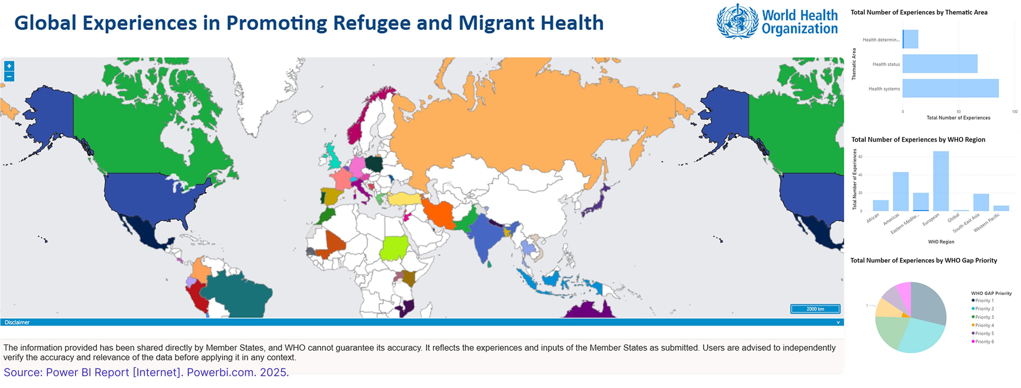 The WHO Dashboard systematizes real-life experiences from countries worldwide, guiding policy development, public health interventions, and health initiatives that promote health equity for refugees and migrants. Based on voluntary submissions by governments and partners, the platform showcases how countries with varying health systems have implemented policies aligned with the WHO Global Action Plan 2019-2030. The dashboard serves as a valuable resource for health workers, decision-makers, academicians, and stakeholders across health financing, gender equity, insurance, statistics, monitoring, advocacy, and civil society organizations.